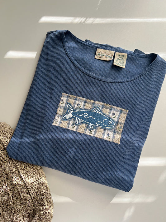 Reworked Large Hand-painted Fish Appliqué St. John’s Bay Long Sleeve Top