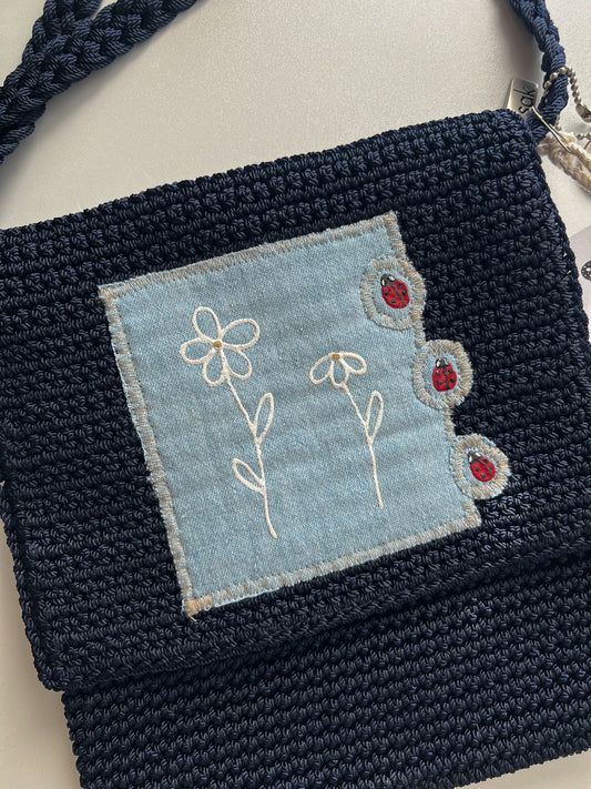 Reworked hand-painted flowers and ladybugs appliqué The Sack bag