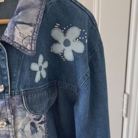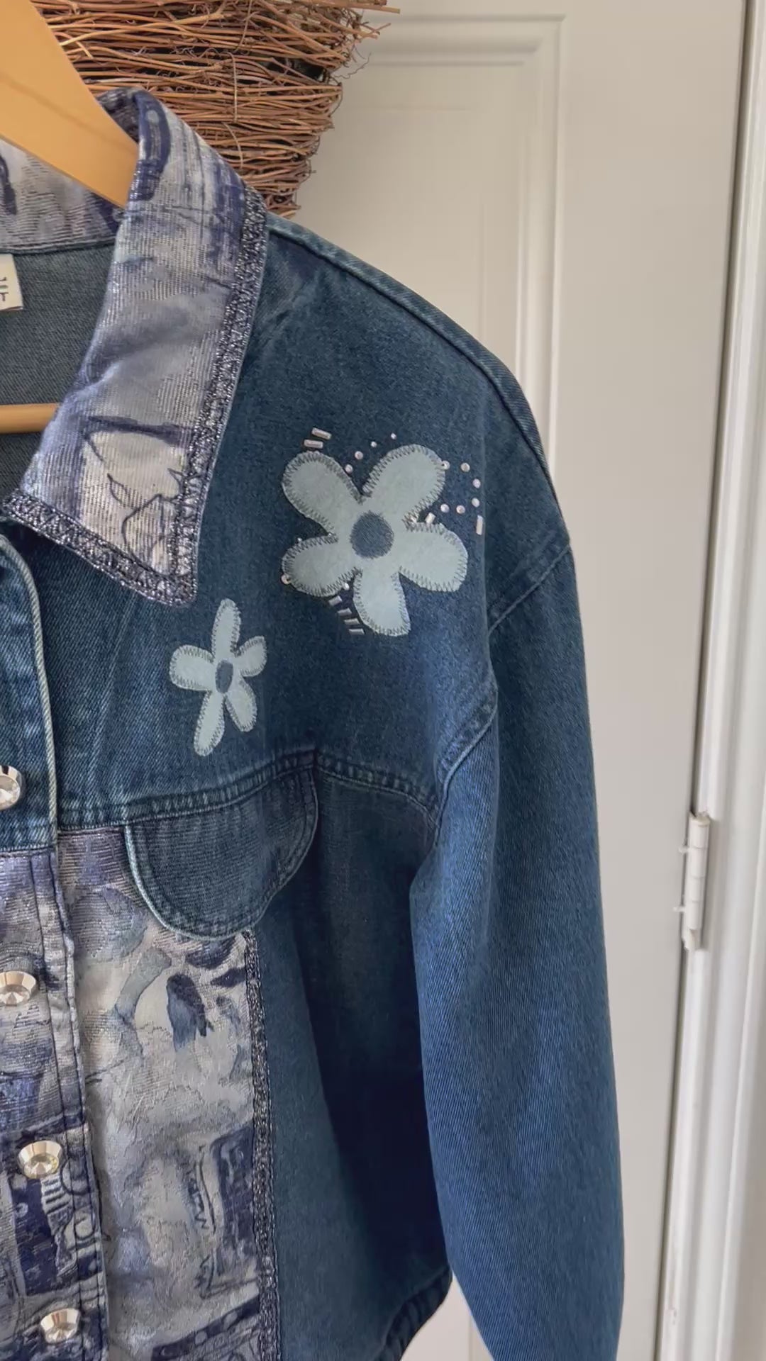 Reworked Large City Girl Sport Floral Appliqué Denim Jacket