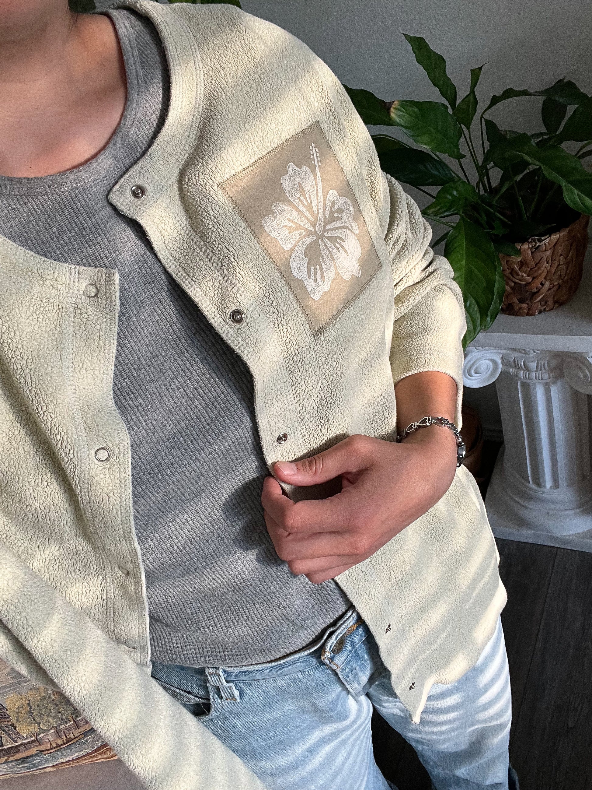 Reworked XL Lino Print Hibiscus Appliqué N.Y.L. Cardi