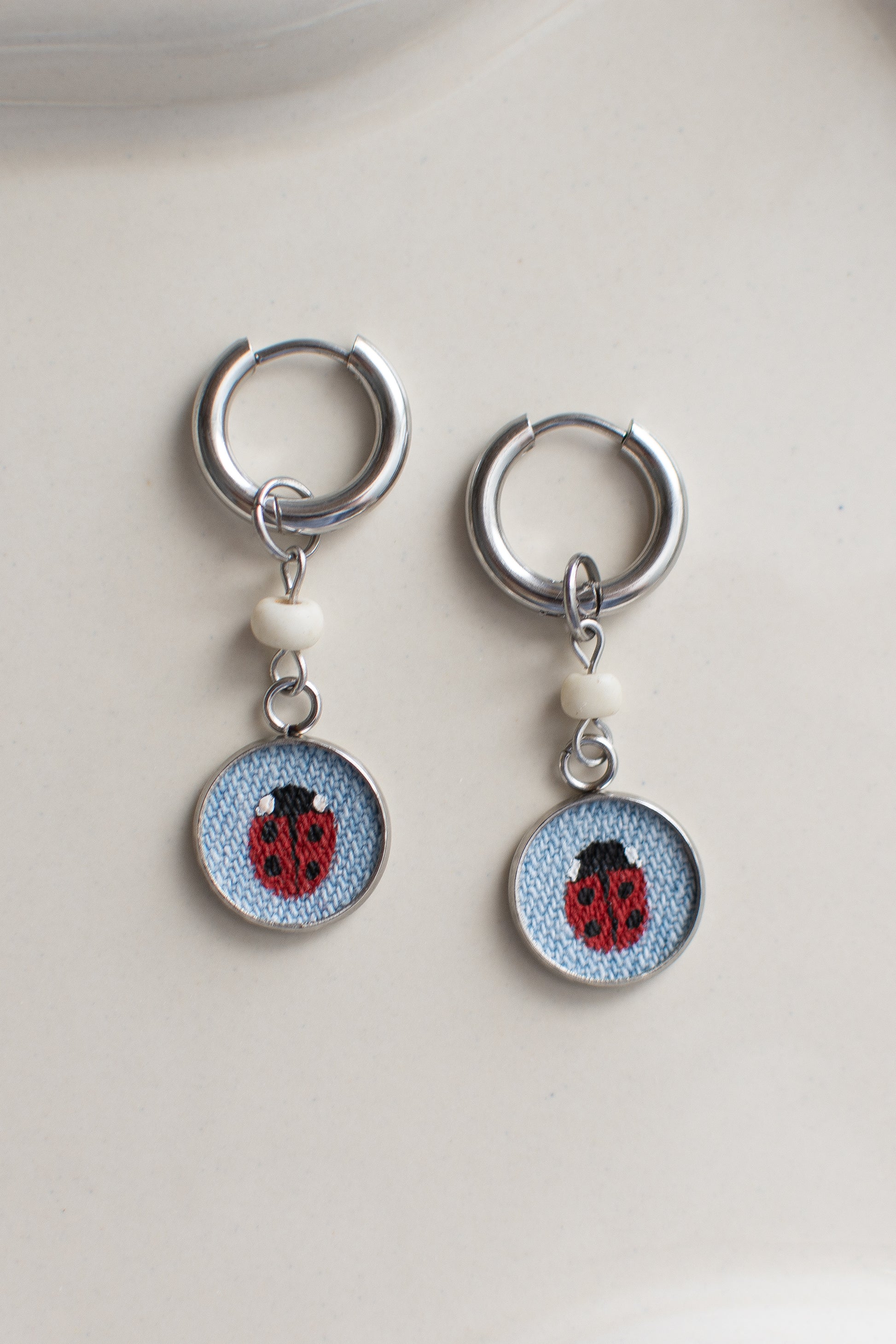 Stainless Steel Hand-painted Ladybugs on Up-cycled Fabric Earrings
